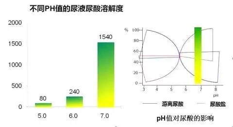 尿酸在中性或弱碱性尿液中的溶解度显著高于酸性尿中的溶解度,提高尿液的pH值可促进尿酸的排泄,比如尿液的pH值从6提高到7,尿酸的溶解度可提高6倍以上。高尿酸病人多半是尿酸的排泄能力不足所致,碱化尿液可产生直接的促排尿酸效果。